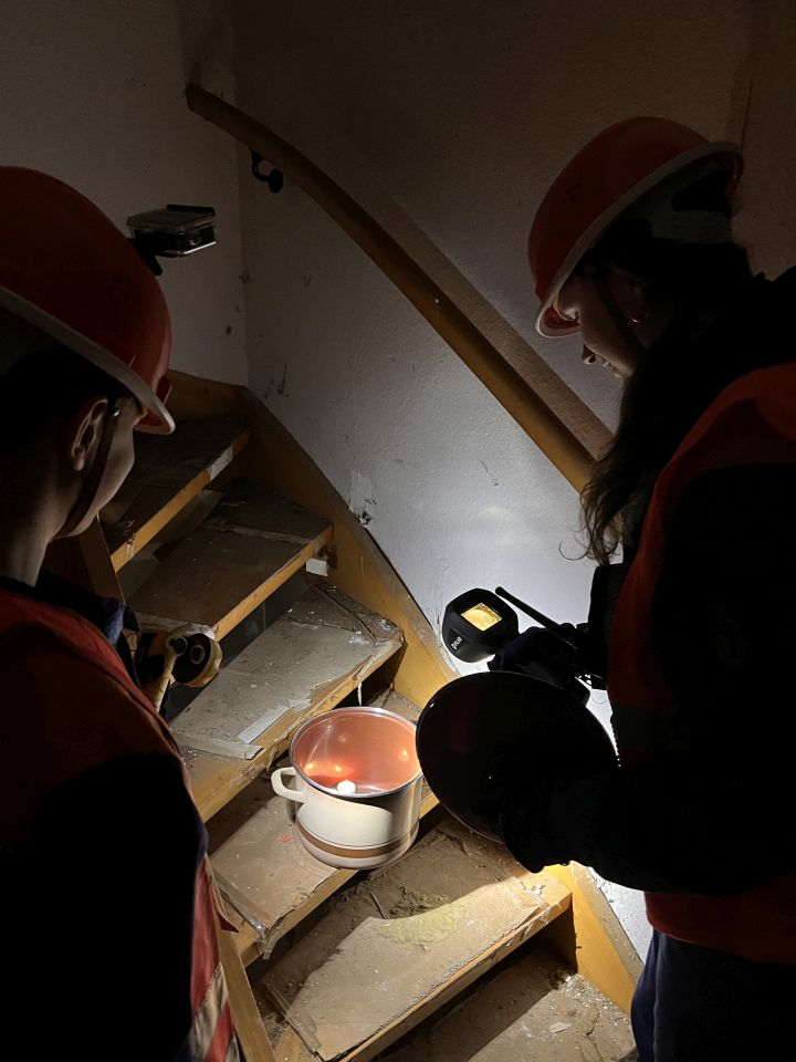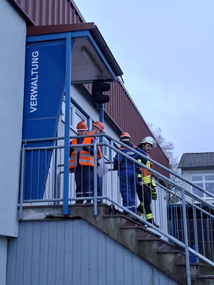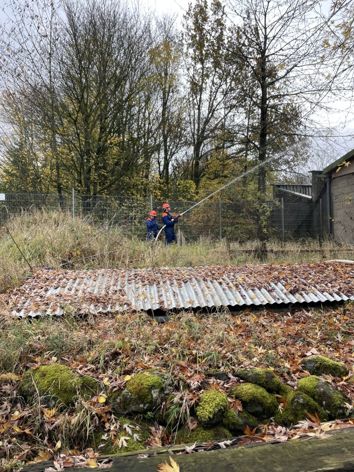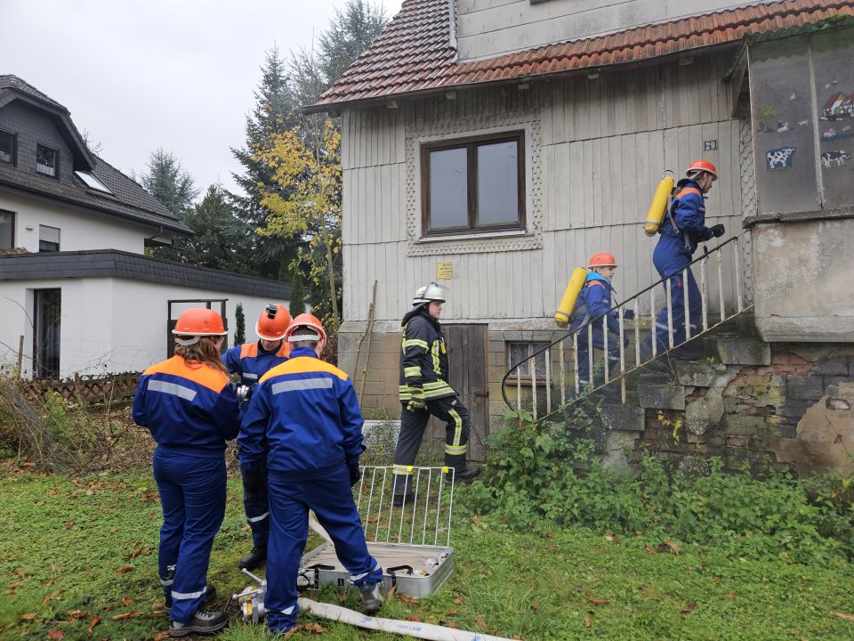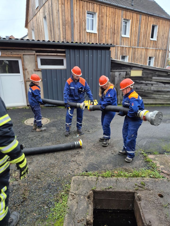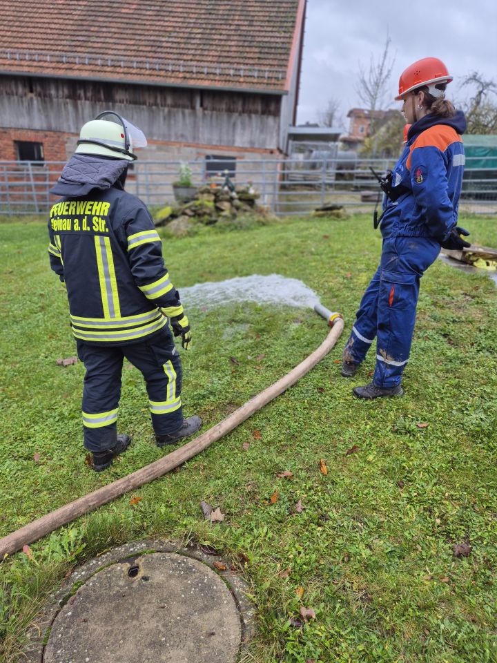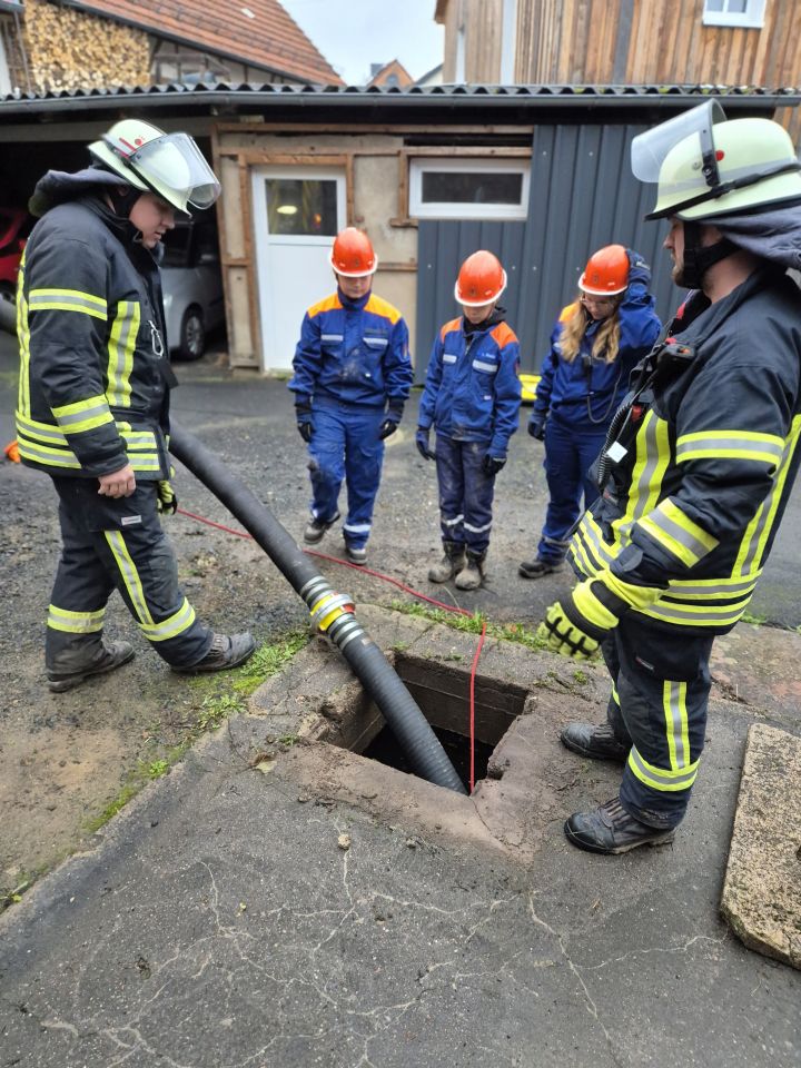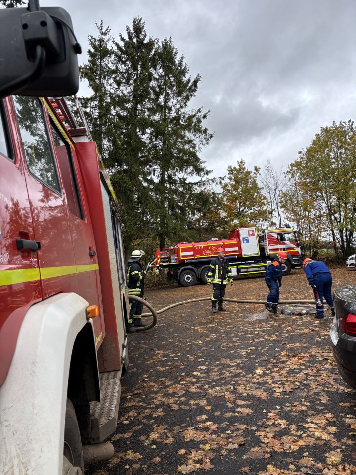 Das TLF 16/25 mit der Gruppe 2 wurde um 7:51 Uhr zu Wasser in einer Baugrube gerufen. Dafür baute die Gruppe zuerst eine Saugleitung zusammen und schlossen einen Saugkorb ans vordere Ende an. Anschließend wurde ein B-Schlauch benutzt, um das Wasser an einem geeigneten Ort rauszulassen.