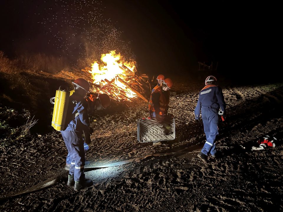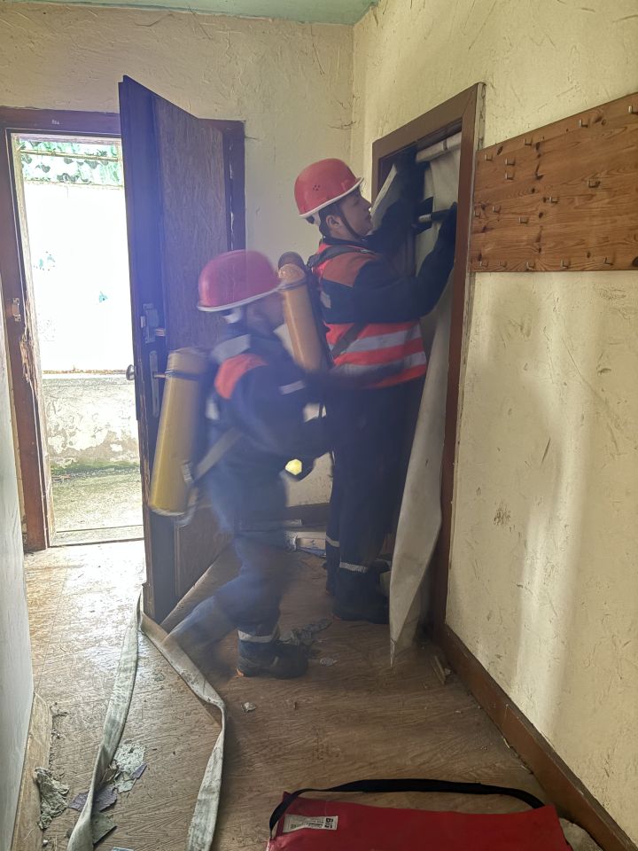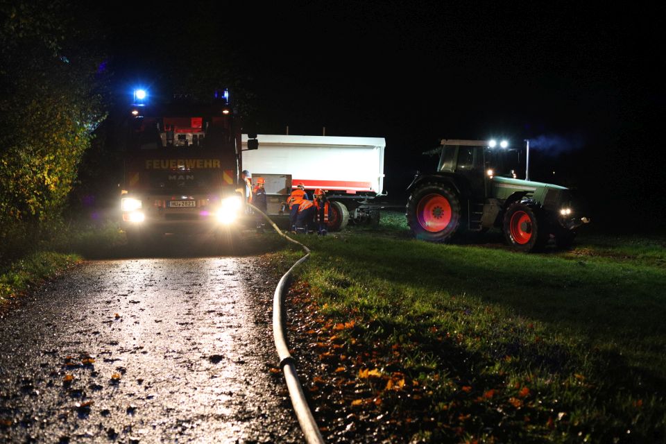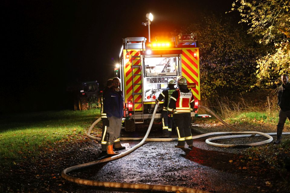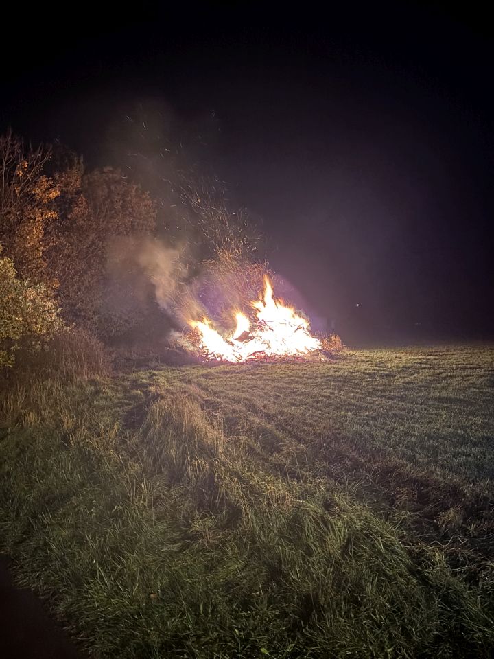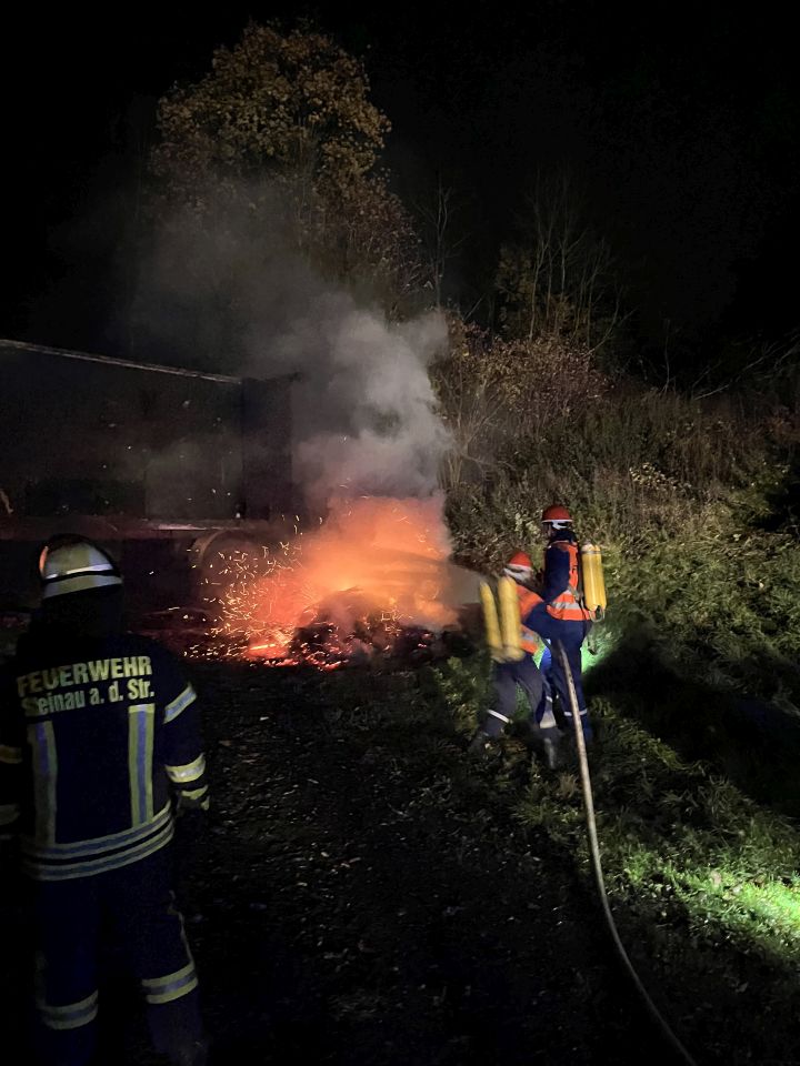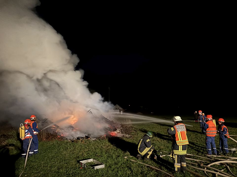 Der Wassertrupp rüstete sich mit Atemschutzgeräten aus und übernahm die Brandbekämpfung mithilfe eines C-Rohres. Der Angriffstrupp zog bei den Nachlöscharbeiten den Brandhaufen auseinander, damit die letzten Glutnester gelöscht werden konnten.