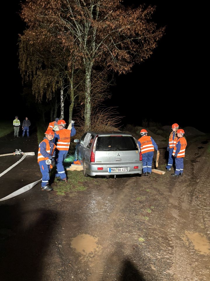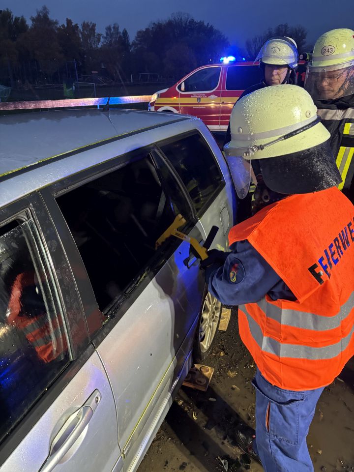 Um 22:15 Uhr am Samstag wurde die Gruppe 3 zu einer Person unter einem PKW gerufen. Während der Angriffstrupp den PKW mit Rüsthölzern unterbaute, sicherte der Wassertrupp die Straße. Der Schlauchtrupp baute den Schnellangriff mit 1. Rohr unter dem PKW auf, um damit Druck zu erzeugen. Als das Auto sich hob, konnte der Angriffstrupp die Person rausziehen und auf eine Trage legen. Die verletzte Person wurde dem RTW übergeben und die Einsatzstelle wurde mit dem TLF 16/25 verlassen.