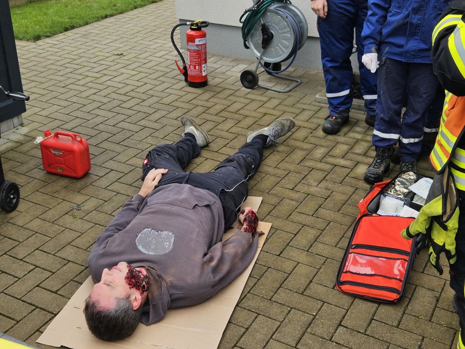 Eine Person hatte sich beim Grillanzünden am Arm und im Gesicht verbrannt. Der Patient wurde von Gruppe 1 betreut und die Brandwunden wurden abgedeckt. Für den Brandschutz wurde ein Feuerlöscher bereitgestellt. Nach der Erstversorgung wurde der Patient an den Rettungsdienst übergeben.