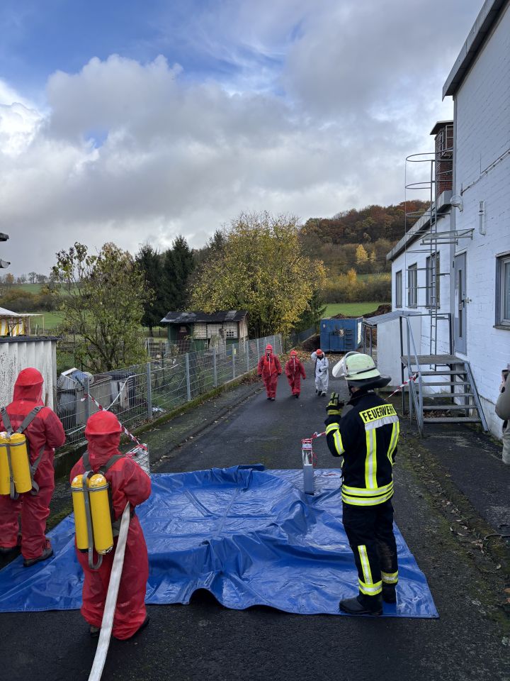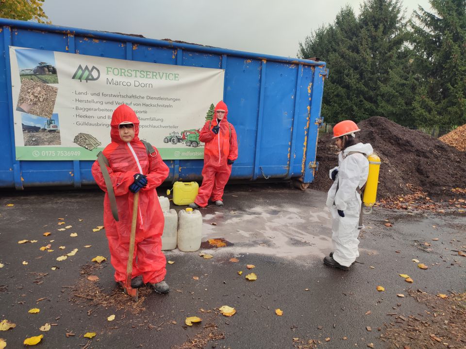 Um 11:04 Uhr wurde die Gruppe 1 mit dem TSF-W und dem Dekon P zu einem Gefahrstoffaustritt aus Kanistern nachalarmiert. Die Gruppe sorgte für Dekontaminationsmaßnahmen, um die Gruppe 3 nach dem Entfernen des Gefahrstoffes zu dekontaminieren. Dazu wurde mit 5 Saugschläuchen und einer Plane ein Dekontaminationsbecken aufgebaut. Außerdem wurde ein C-Rohr aufgebaut, um das Abwaschen des Gefahrstoffes zu simulieren.