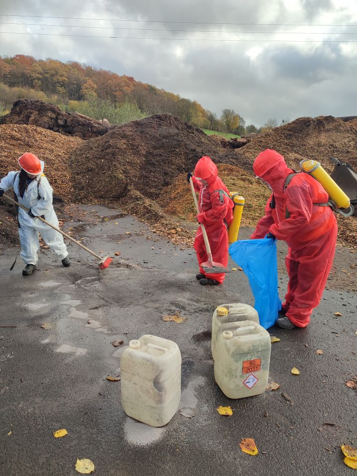 Am Sonntag um 10:59 Uhr wurde die Gruppe 3 mit dem LF 10zu einem auslaufendem Gefahrgut gerufen. Der Wassertrupp sperrte den kontaminierten Bereich ab und der Angriffstrupp stattete sich mit einem Funkgerät, CSA-Anzügen und Atemschutz aus. Danach konnte der Angriffstrupp das auslaufende Gefahrgut mit Rücksprache zum Gruppenführer als Salpetersäure identifizieren. Das ausgelaufene Gefahrgut wurde mit Bindemittel eingekehrt. Zum Schluss wurde der Angriffstrupp von der Gruppe 1 dekontaminiert.