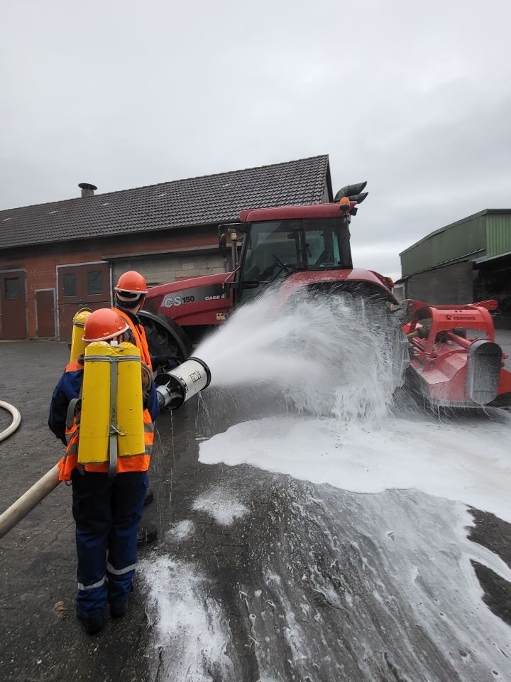Um 15:59 Uhr wurde die Gruppe 1 während der Kaffee- und Kuchenpause zu ihrem ersten Einsatz alarmiert. Gruppe 1 rückte mit dem TLF 16/25 zu einem Traktorbrand nach Sarrod aus. An der Einsatzstelle eingetroffen, rüstete sich der Angriffstrupp mit Atemschutz aus, während der Wassertrupp die Einsatzstelle absicherte. Der Angriffstrupp löschte den brennenden Traktor mit einem Schaumrohr ab. Der Schlauchtrupp bediente hierfür den Zumischer. Die Wasserversorgung sollte durch den Wassertrupp aufgebaut werden. Da sich der Hydranten Deckel allerdings nicht öffnen ließ und das Feuer schnell gelöscht war, wurde entschieden, den Wassertank des Feuerwehrautos am Feuerwehrgerätehaus aufzufüllen.