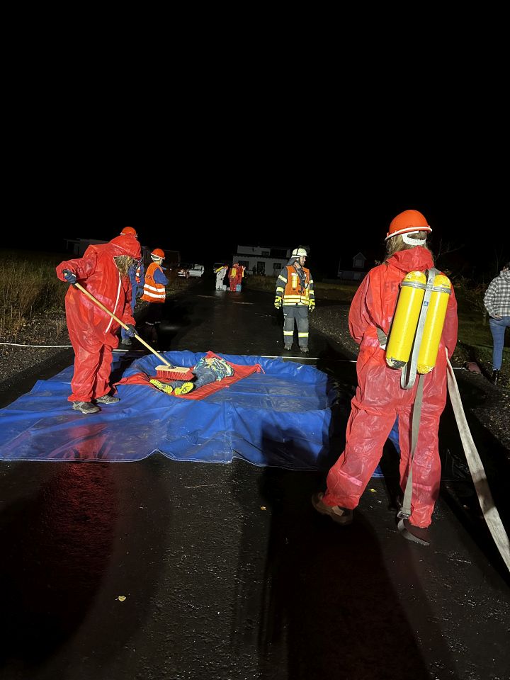 Um 18.58 Uhr wurde Gruppe 2 mit dem LF 10 zu einer Personenrettung mit austretendem Gefahrgut alarmiert. Während der Schlauchtrupp und Wassertrupp den Gefahrenbereich absicherten, betrat der Angriffstrupp den Bereich, um das Gefahrgut ausfindig zu machen und die verunglückten Personen zu retten. Da eine im Auto verunglückten Personen bewusstlos und der Andere nicht mehr laufen konnte, kamen der Schlauchtrupp und der Wassertrupp mit den Rettungsliegen zur Unterstützung. Der Angriffstrupp brachte die beiden Verletzten zum Rand des Gefahrenbereichs und wurde von Gruppe 3 dekontaminiert. Der Wassertrupp und der Schlauchtrupp beseitigten unter Verwendung der CSA-Anzüge den Gefahrenstoff und wurden anschließend, in dem von Gruppe 3 aufgebauten Becken, dekontaminiert.