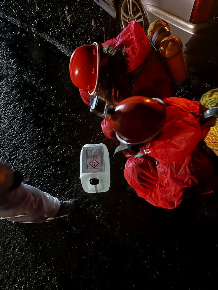 Um 6:10 Uhr wurde Gruppe 2 mit dem TSF-W und dem Dekon als Amtshilfe für die Polizei alarmiert. Während der Angriffstrupp den Einsatzort absicherte und den Gefahrenbereich eingrenzte, legten der Wassertrupp und der Schlauchtrupp Atemschutzgeräte an und statteten sich mit einer Handlampe aus. Als sichergestellt wurde, dass sich keine Personen mehr vor Ort befanden, betraten sie das Gebäude und sicherten das Gefahrgut.