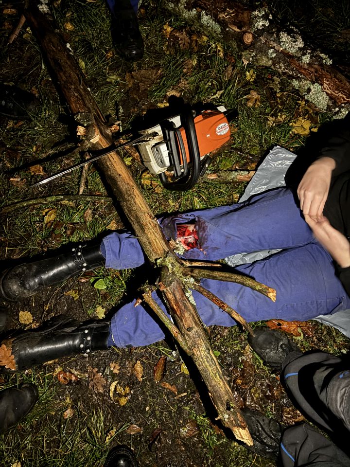 Die Gruppe 3 wurde am Samstag um 20:33 Uhr mit dem MTW zu einer Person gerufen, die sich mit einer Motorsäge in ein Bein geschnitten hatte. Die Person war ansprechbar, während der Angriffstrupp Erste-Hilfe leistete. Der Wassertrupp beleuchtete die Einsatzstelle und der Schlauchtrupp wies den RTW ein. Die Gruppe 3 legte die Person auf ein Tragetuch und trug sie in den RTW.