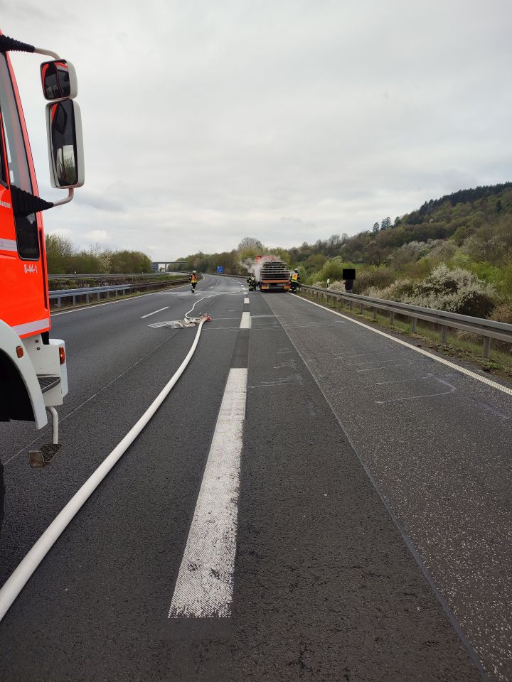 Heute Morgen wurden wir zusammen mit der Feuerwehr Steinau und dem Rettungsdienst zu einem brennenden LKW auf die A66 Alarmiert. Der LKW stand zwischen den Anschlussstellen Schlüchtern Süd und Steinau auf dem Standstreifen. Der ersteintreffende Rettungsdienst und der zufällig vorbeikommende Rüstwagen aus Salmünster sicherten die Einsatzstelle ab und unternahmen erste Löschversuche. Durch die Feuerwehr Steinau wurde der brennende Reifen mit einem Trupp unter Atemschutz abgelöscht. Wir unterstützen bei der Absicherung des Rechten Fahrstreifens. Nachdem das Feuer aus war konnten wir die Rückfahrt zum Gerätehaus antreten.